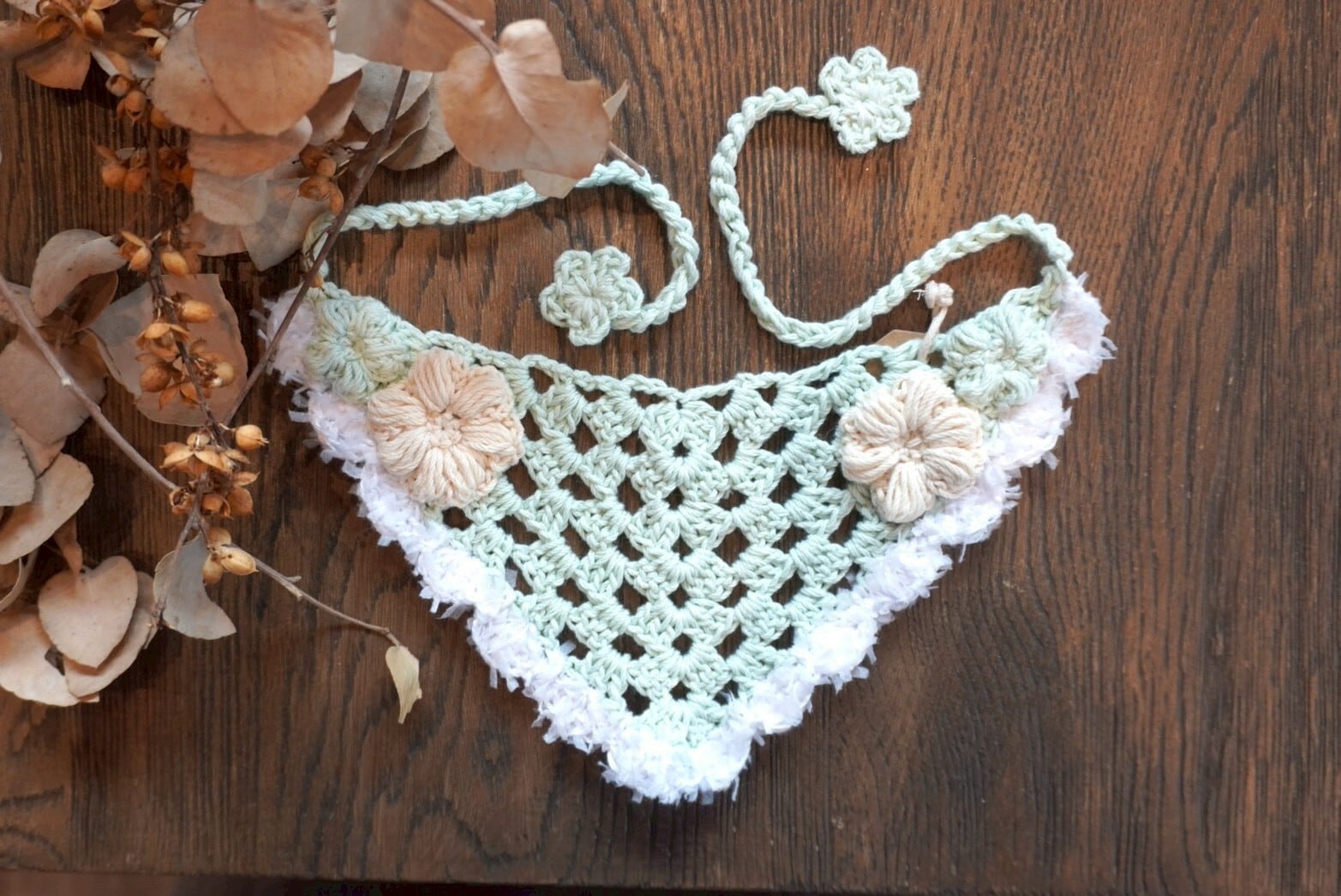 柔らかい毛糸で丁寧に編まれたワンちゃん用バブーシュカです。スタイにも◎
